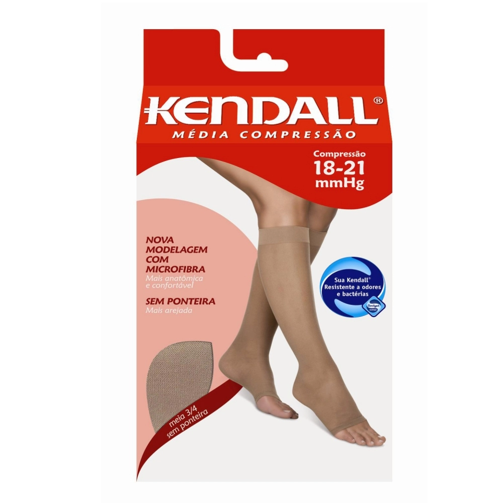 A Meia Kendall 3/4 com ponteira (18-21 mmHg) tem compressão graduada, o que significa que a maior compressão está concentrada no tornozelo e vai decrescendo gradativamente até a altura da panturrilha. Essa compressão facilita o retorno do sangue dos membros inferiores ao coração.