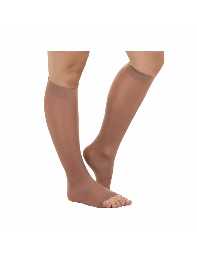 A Meia Kendall 3/4 com ponteira (18-21 mmHg) tem compressão graduada, o que significa que a maior compressão está concentrada no tornozelo e vai decrescendo gradativamente até a altura da panturrilha. Essa compressão facilita o retorno do sangue dos membros inferiores ao coração.
