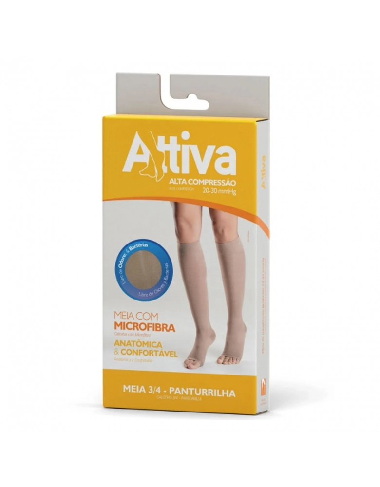 Attiva é um produto terapêutico, produzido com avançada tecnologia, que exerce compressão graduada em todo membro inferior. A terapia de compressão ajuda a circulação sanguínea, diminuindo o diâmetro da veia dilatada e auxiliando no retorno venoso, o que diminui as dores, inchaço e sensação de pernas cansadas. A compressão graduada exerce 100% de sua compressão no tornozelo, diminuindo gradualmente até a coxa, fazendo com que a eficiência e eficácia da meia seja aumentada.