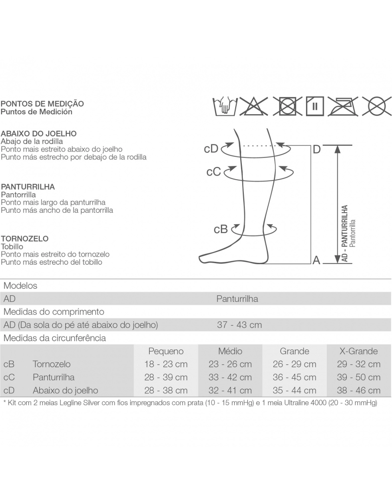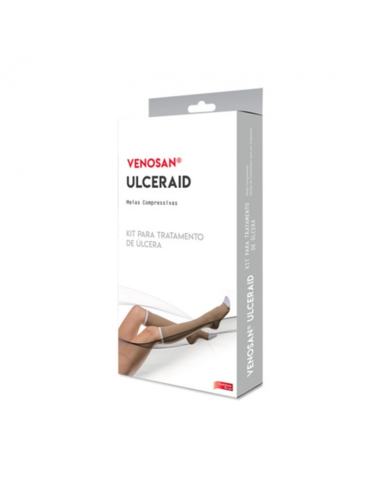 O Kit para tratamento de úlcera é um sistema de sobreposição de 2 meias e é composto de 3 meias: 2 meias interior de compressão (10 – 15 mmHg) para troca diária, fabricadas com fios impregnados de prata deslizantes, e 01 meia exterior de compressão, Ultraline 4000 (20 – 30 mmHg). Sobrepostas, atingem uma compressão média de (30 – 45 mmHg).