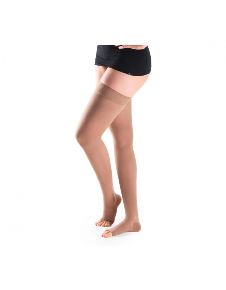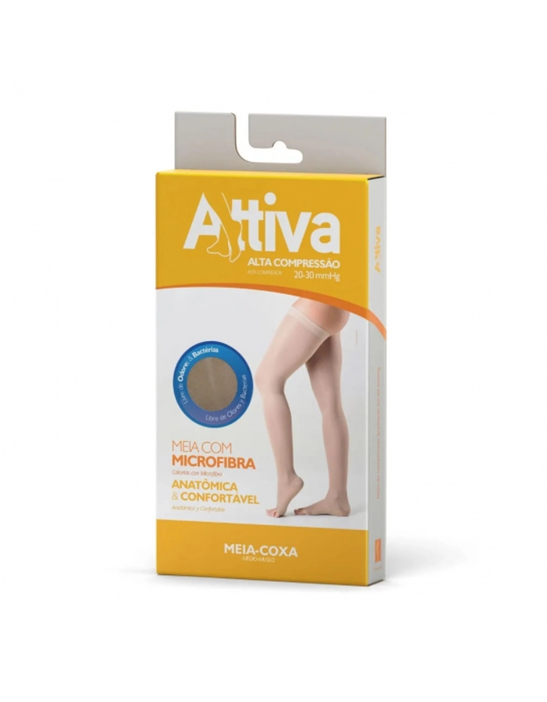 Attiva é um produto terapêutico, produzido com avançada tecnologia, que exerce compressão graduada em todo membro inferior. A terapia de compressão ajuda a circulação sanguínea, diminuindo o diâmetro da veia dilatada e auxiliando no retorno venoso, o que diminui as dores, inchaço e sensação de pernas cansadas. A compressão graduada exerce 100% de sua compressão no tornozelo, diminuindo gradualmente até a coxa, fazendo com que a eficiência e eficácia da meia seja aumentada.