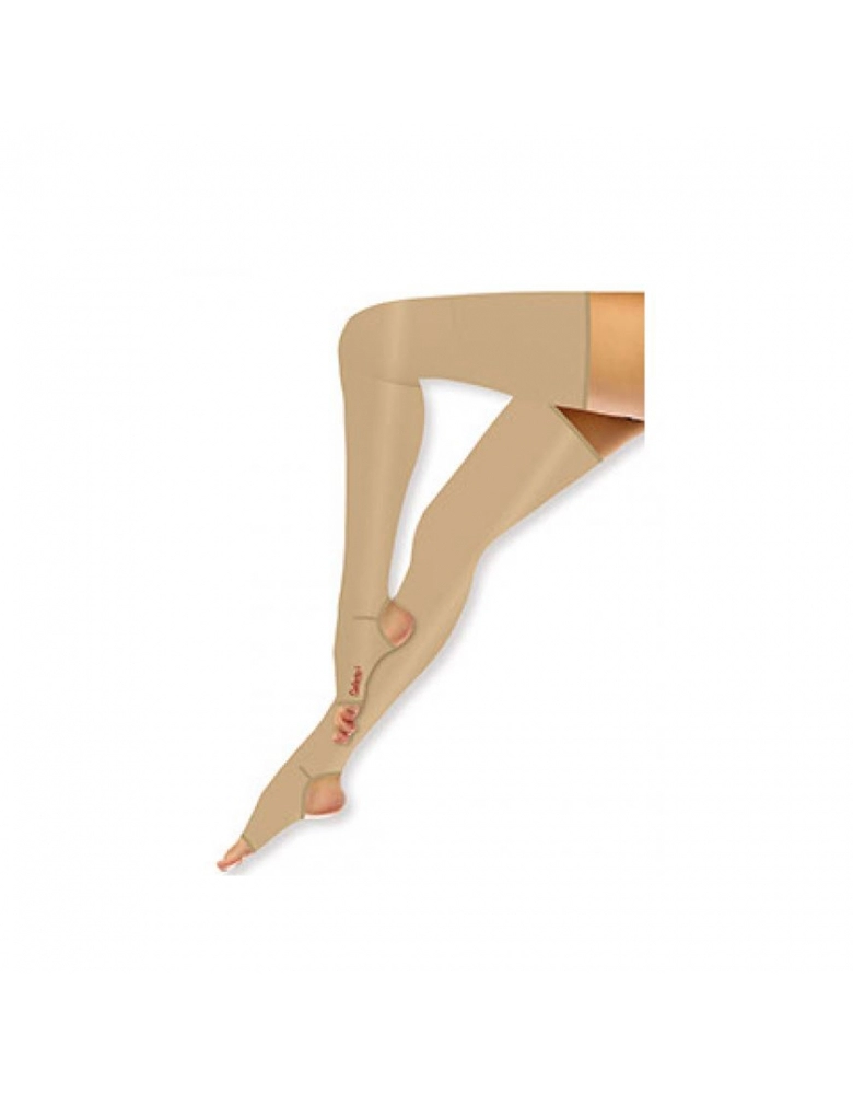 É uma meia de alta compressão feita de helanca com formato anatômico que proporcionam maior conforto ao usuário. Seu calcanhar e ponta do pé são abertos, auxiliando no momento de vestir a meia.