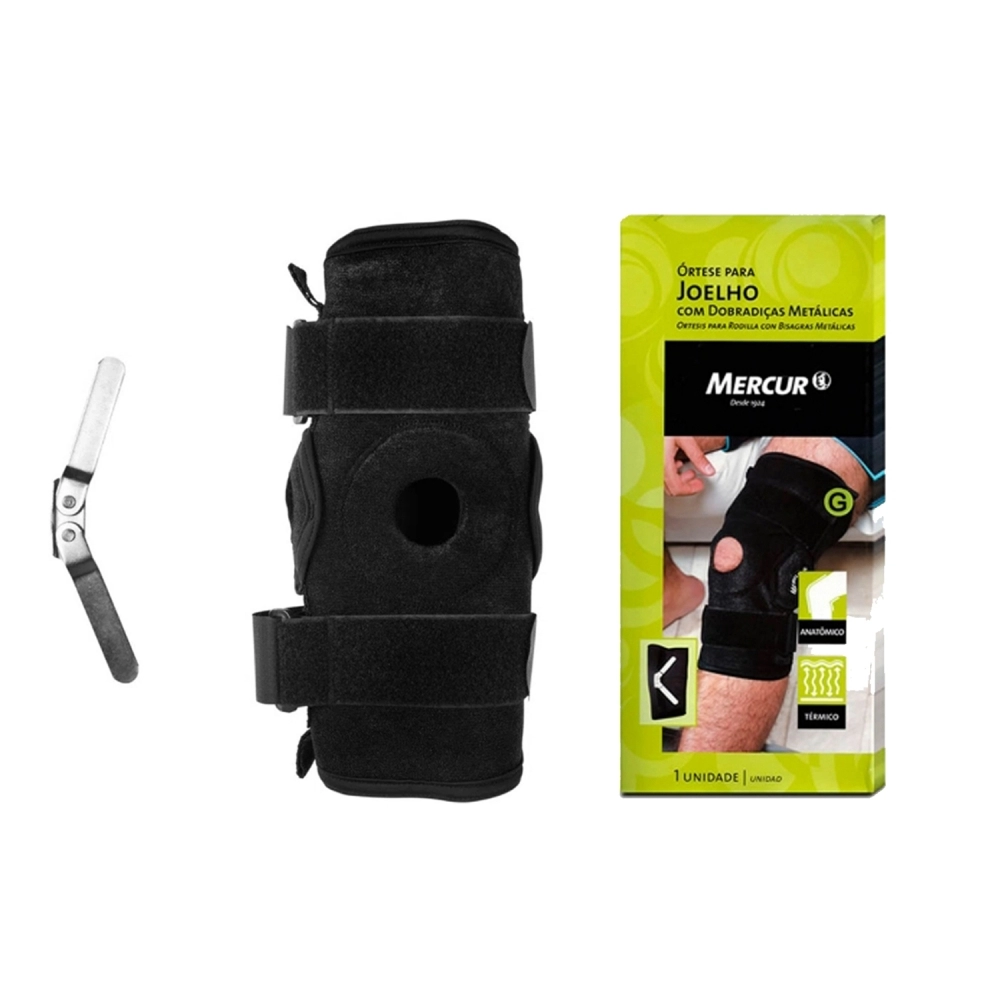 Possui dobradiças metálicas laterais com trava, que evitam movimentos de lateralização e impedem a hiperextensão do joelho. Além disso, ao inverter as dobradiças, a órtese pode ser utilizada para impedir o movimento de flexão, imobilizando a articulação do joelho. O produto contém faixas ajustáveis para maior compressão e é confeccionado em Neoprene®, que retém o calor corporal, auxiliando na redução da dor e prevenção de lesões. Pode ser usada tanto no joelho direito quanto no esquerdo.