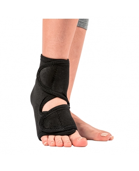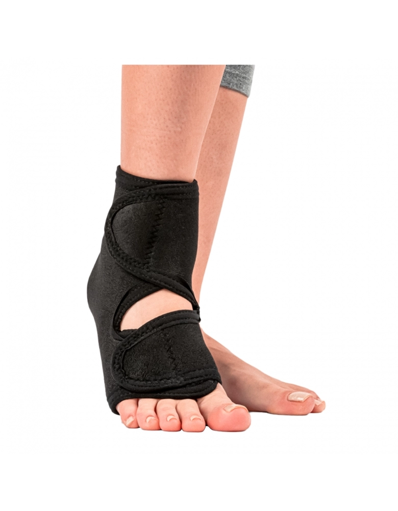 - Coloque a órtese de maneira que o orifício fique posicionado no calcanhar e ajuste abas com fecho aderente, no peito do pé e no tornozelo de modo que fique confortável.