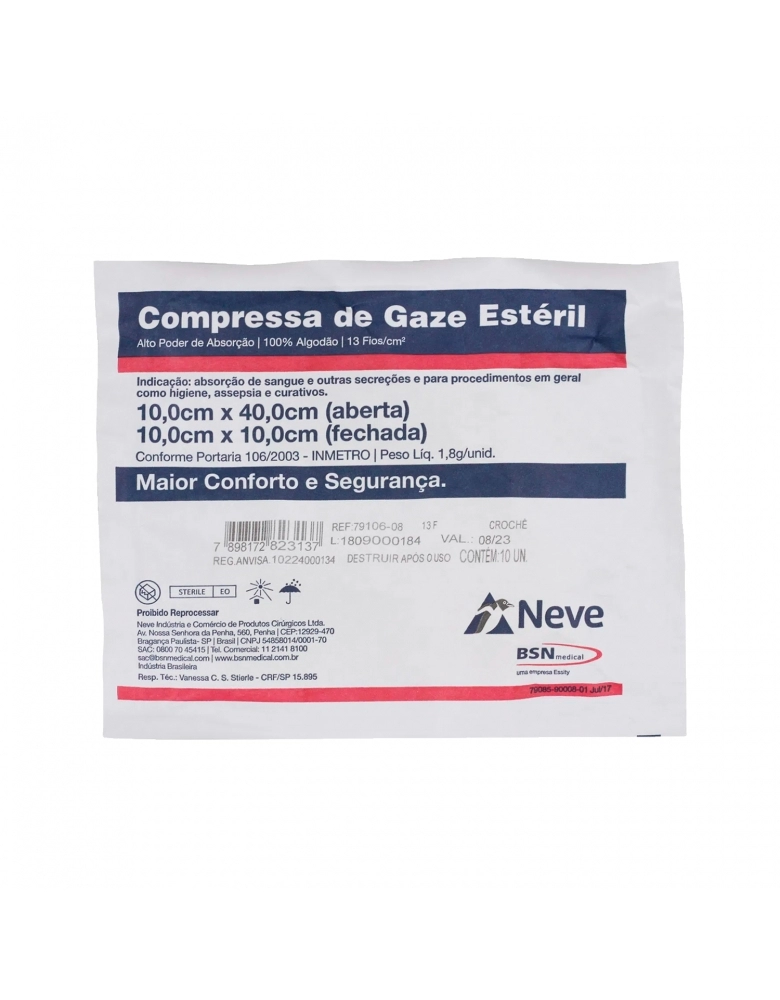 As Compressas de Gaze Estéril Neve são confeccionadas em tecido 100% algodão, neutro, macio, com alto poder de absorção, alvejado e purificado, apresentando-se isento de sujidades, impurezas, substâncias gordurosas, amido, corantes corretivos e alvejantes ópticos.