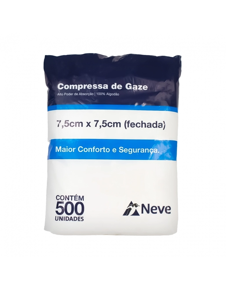As Compressas de Gaze Neve são confeccionadas em tecido 100% algodão, neutro, macio, com alto poder de absorção, alvejado e purificado, apresentando-se isento de sujidades, impurezas, substâncias gordurosas, amido, corantes corretivos e alvejantes ópticos.
