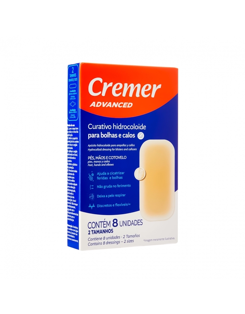 Possui exclusiva tecnologia hidrocoloide, que cria condições ideais para auxiliar na absorção de secreções da pele. Ajuda também no alívio da inflamação e vermelhidão. Dica: A prevenção é o melhor remédio. Não espere bolhas e calos aparecerem para tratá-los. Você pode utilizar o curativo Cremer Advanced Cuidado e Proteção de forma preventiva nas regiões mais sensíveis e afetadas da sua pele.