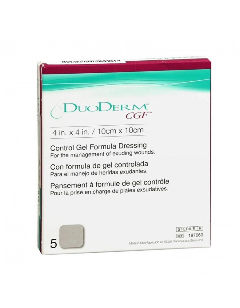 DuoDERM® CGF é um curativo adesivo estéril, hidrocolóide, com fórmula de controle de gel. Os hidrocolóides (carboximetilcelulose sódica, pectina e gelatina) estão contidos dentro da matriz de polímeros elastoméricos que aumentam a capacidade de conter o exsudato formando um gel coesivo e sobre esta há uma camada de espuma de poliuretano.