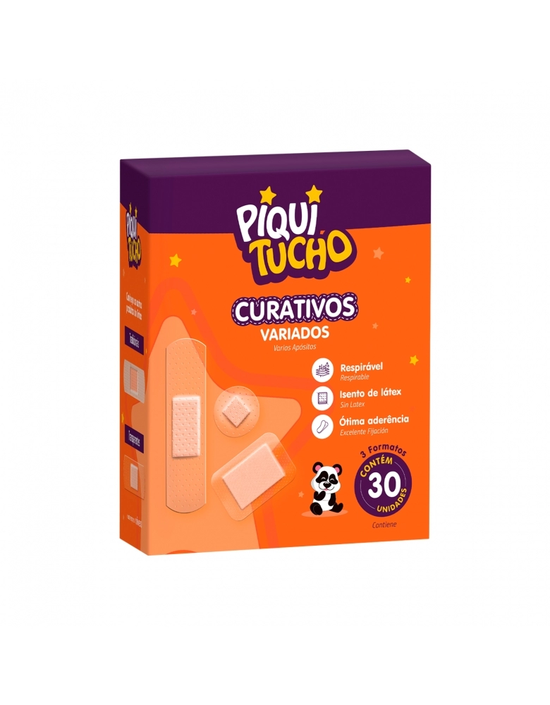 Os Curativos Variados Piquitucho são compostos por três formatos diferentes de curativos transparentes: redondo, extragrande e formato tradicional. Sendo eles, flexíveis e adaptáveis a todos os ferimentos, além de também serem resistentes e hipoalergênicos. Seu filme plástico perfurado permite que a pele respire, sem grudar ao ferimento, acelerando a cicatrização.