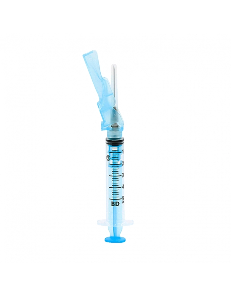 O protetor do tipo articulado deve ser ‘acionado’ após a utilização da seringa, deslocando-o na direção da agulha para alojá-la após o uso, evitando assim acidentes por punção, já que não é necessário reencapar a agulha com o protetor convencional.
