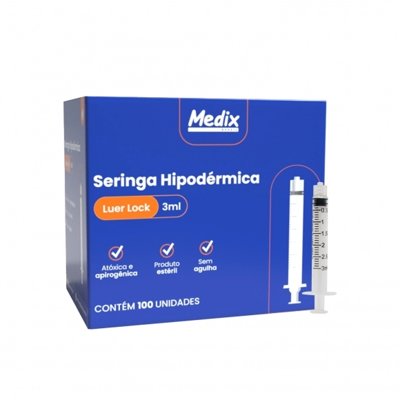 A Seringa Hipodérmica Descartável Sem Agulha 3 mL Luer Lock da Medix é um dispositivo estéril, de uso único, desenvolvido para aspiração ou administração de líquidos e medicamentos por via hipodérmica. Fabricada em corpo transparente de polipropileno com escala volumétrica clara e graduada, possui êmbolo lubrificado para deslize suave, anel de retenção para evitar desprendimento e conexão tipo Luer Lock que garante encaixe seguro. Indicada para clínicas, hospitais e usos que exigem precisão e segurança. O produto vem em embalagem de 100 unidades (versão comercial comum) e atende aos padrões de esterilização e qualidade aplicados pela Medix.
