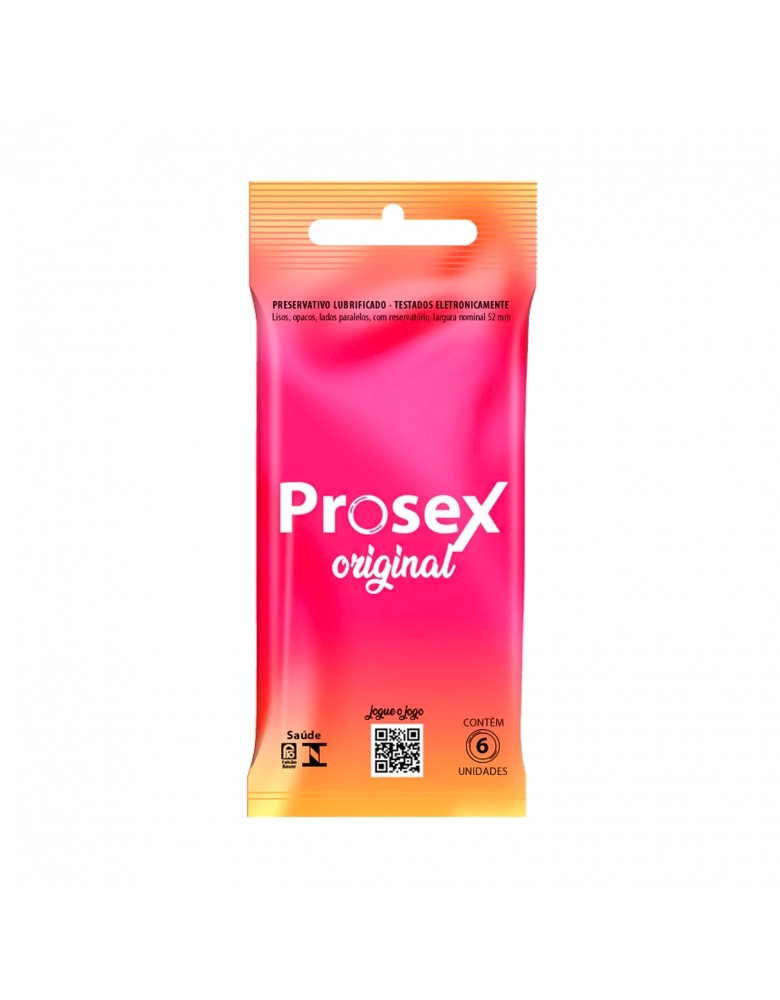 O preservativo Prosex lubrificado original é o mais Premium que você pode encontrar no mercado, com paredes lisas, largura nominal padrão de 52mm e sachê com 6 unidades. Apresenta maciez e lubrificação exata para que sua relação sexual seja melhor e a estimulação aumente. Também ajuda a evitar irritações, encaixa perfeitamente proporcionando segurança e conforto.